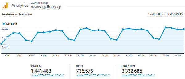 More than 680.000 unique users visit Galinos.gr every month. In 2011, when the portal went online, the average monthly pageviews were 440.000. Today, the website traffic is 7-8 times greater, reaching 3,3 millions pageviews per month. Below, a Google Analytics report provides an overview of the audience statistics for January 2019.